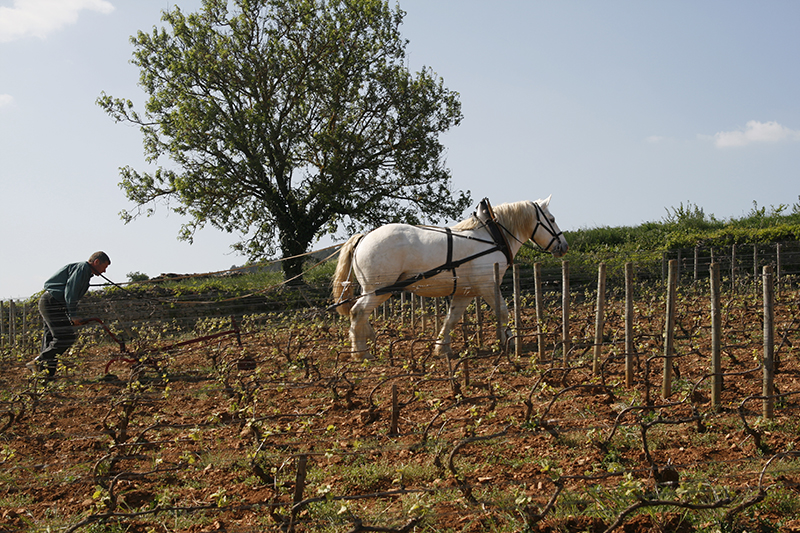 Toutes les parcelles du domaine sont labourées, afin de permettre une meilleure aération des sols. Aucun herbicide n’est utilisé. Une grande partie des travaux de la vigne est réalisée en fonction du calendrier lunaire. L’objectif de Rodolphe Demougeot est d’obtenir des raisins les plus sains et les plus gouteux possibles. Pour se faire, le vigneron opte pour une taille longue, un ébourgeonnage sévère et un effeuillage si nécessaire, afin de permettre aux grappes d’être bien espacées. Les vendanges sont 100 % manuelles.